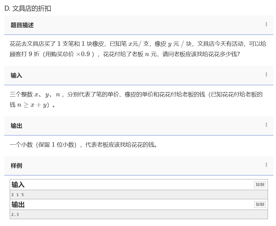 cin >> x >> y >> n;:输入笔的价格、橡皮的价格和花花付的钱。double total = x + y;:计算总原价。double discounted = total * 0.9;:计算打9折后的价格。double change = n - discounted;:计算找回的钱。cout << fixed << setprecision(1) << change << endl;:输出找回的钱,保留一位小数(如输入 2 1 5,输出 2.3)。