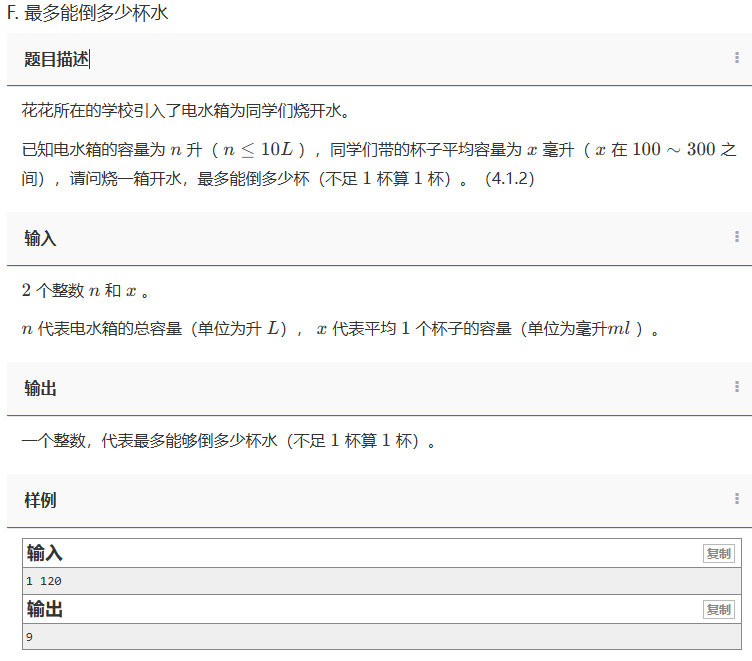 - 计算公式:杯数 = ceil(总毫升数 / 每杯毫升数) = ceil(n * 1000 / x)