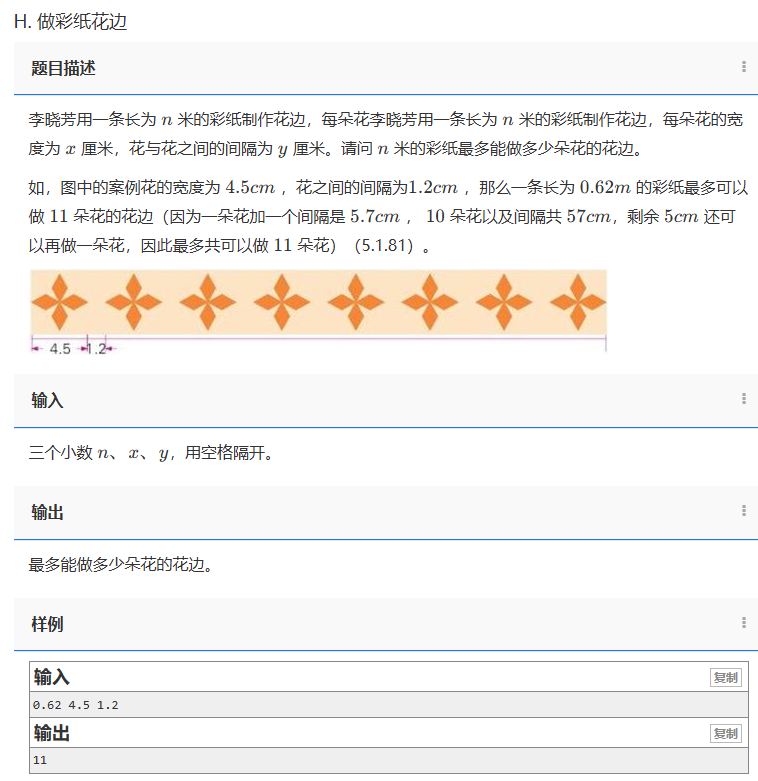 - 每朵花占用空间:x + y 厘米(一朵花加一个间隔)