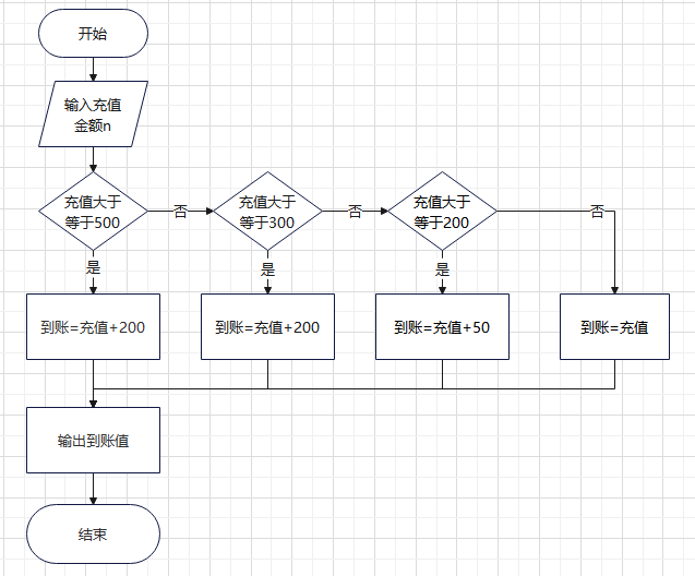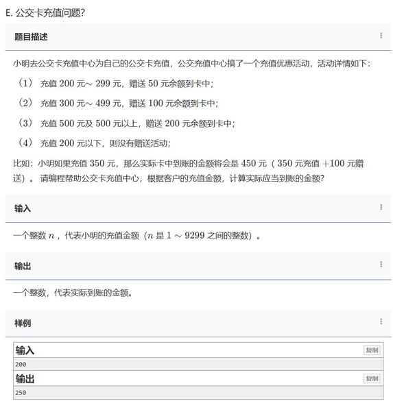 - 输出是实际到账的金额,根据充值金额的不同区间,赠送不同的金额: