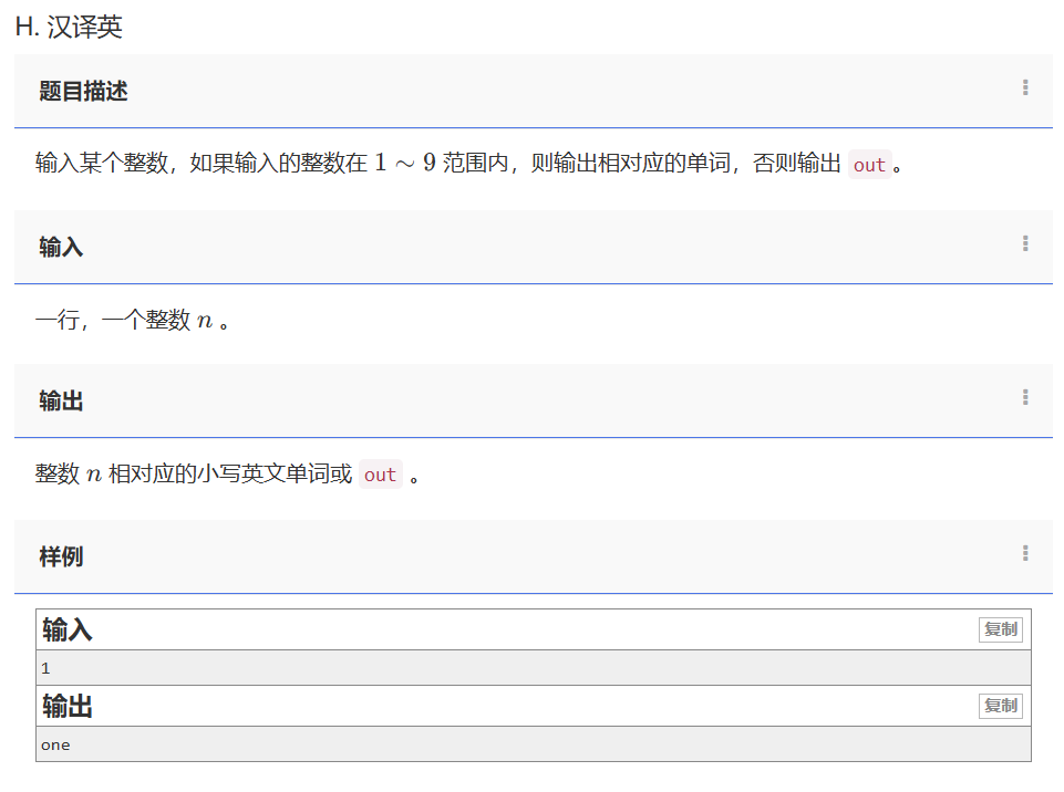 - 输出要求:如果 (n) 在 (1 \sim 9) 范围内,输出对应的小写英文单词(如 one、two 等);否则输出 “out”。