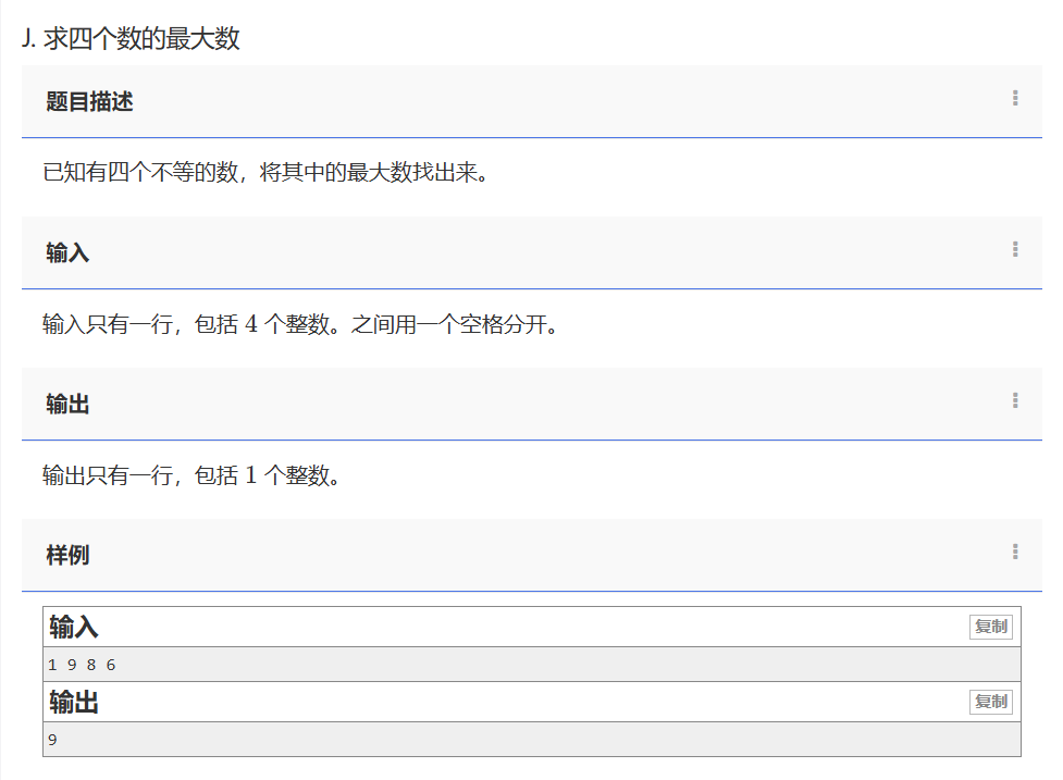 题目要求从四个整数中找出最大值,由于题目明确说明四个数不相等,因此不需要处理相等的情况。核心算法是通过比较每个数来更新最大值,逐步确定最终结果。