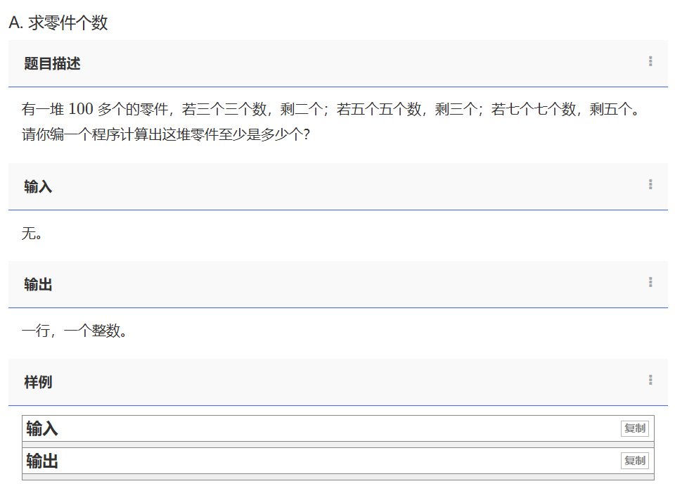 题目要求找出一堆零件的最小个数,满足:零件总数大于100,且满足以下三个条件: